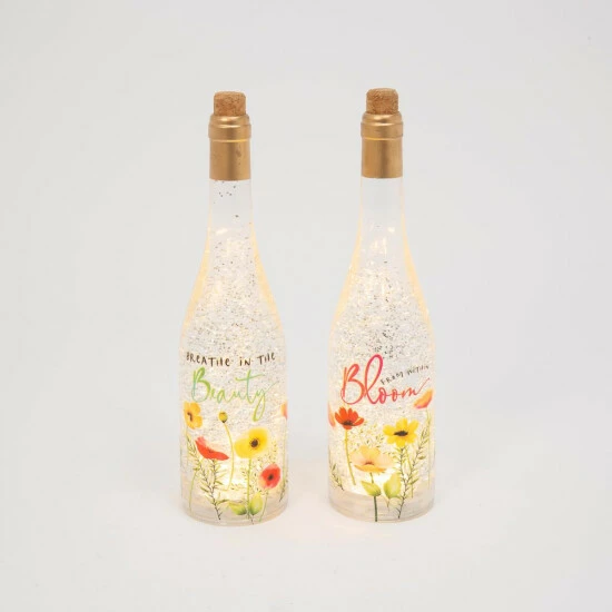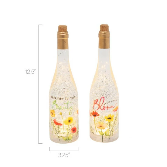 Everyone finds water globes delightful and this battery operated set of 12.5-inch high bottles is no exception. Each is a unique wine bottle shape filled with lighted glittery water that spins gently. Each bottle is decorated with beautiful bright poppies. They are perfect for displaying in different parts of your home, or make a stunning center piece. They also make great individual gifts.