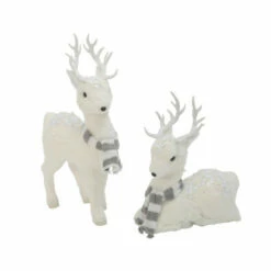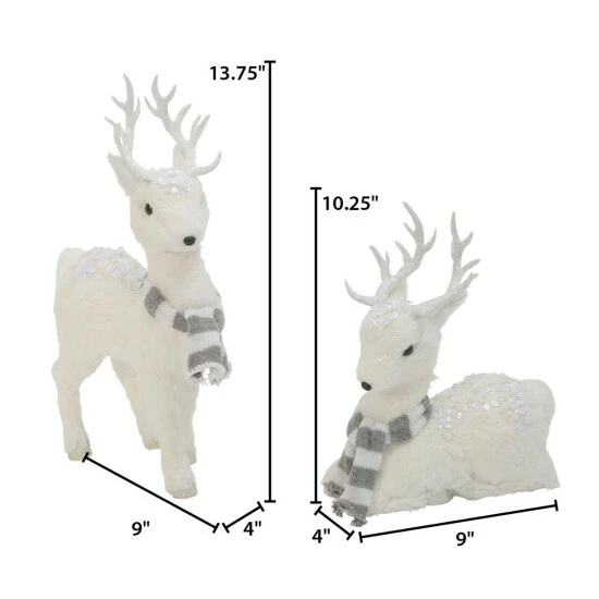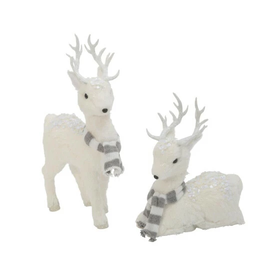 This set of two marvelously crafted winter white deer, with warm grey and white striped sweaters around their necks, will be a welcome addition to your holiday dΓ©cor. Their faux fur is adorned with glittery white sequins and beads. White glittery antlers and textured silver glitter hooves complete the set.
