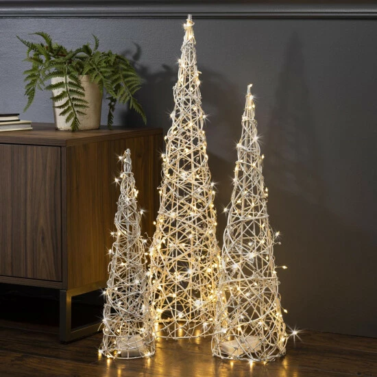 Add elegant illumination to your holiday decorations this year with this set of 3 Vine Cones with Super Bright Micro LED Lights. These cones are illuminated by incredibly bright white LED lights to add some radiance to your indoor decorations. They also feature a 6-hour on, 18-hour off timer to conserve battery life.