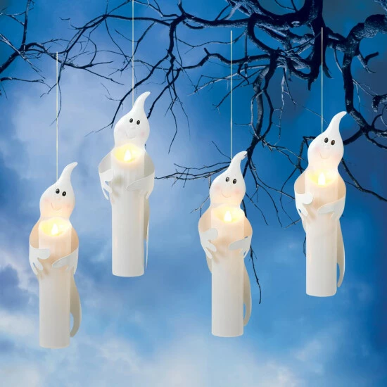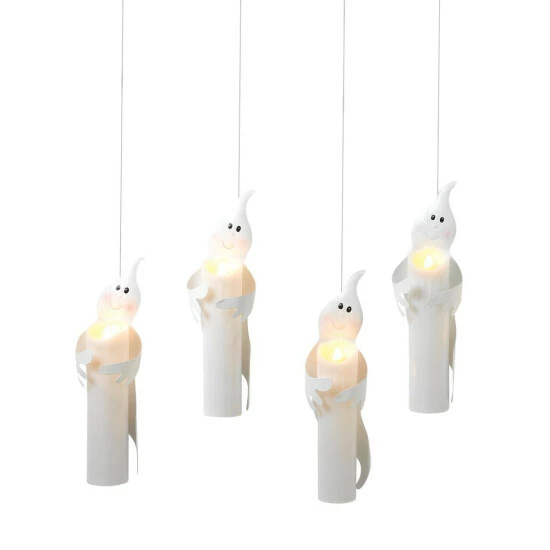 This set of 4 battery-operated white metal ghosts wrapped around LED candles appear to be hanging in mid air! Hanging from a 35-inch clear line, each lighted ghost candle uses 2 AA (8 total) batteries (not included).